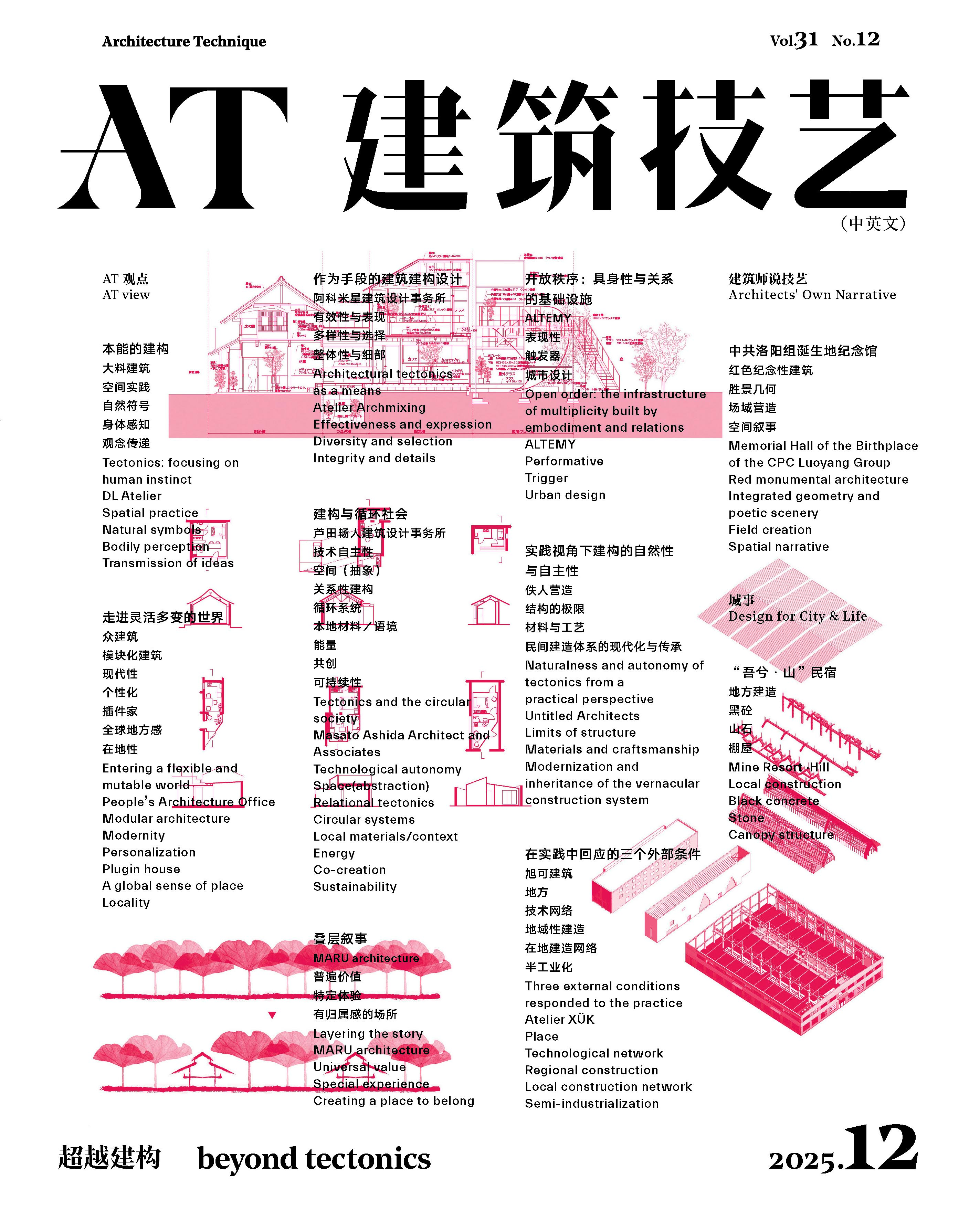 《建筑技艺》杂志创刊于1994年,由中国建设科技集团股份有限公司主管,亚太建设科技信息研究院有限公司主办,中国工程院崔愷院士任编委会主任,李兴钢院士任编委会执行主任。现为中国学术期刊网络出版总库收录期刊、中国核心期刊(遴选)数据库收录期刊、万方数据库系统数字化期刊群收录期刊、超星期刊“域出版”平台,入选“建筑科学领域高质量科技期刊分级目录(2024年)”T3级,是清华大学、同济大学、华南理工大学、天津大学、东南大学、重庆大学、浙江大学、沈阳建筑大学、深圳大学、北京建筑大学、华中科技大学等知名高校建筑学专业认定的核心期刊。聚焦于“建筑技术和艺术的融合”,主打栏目“AT建筑”每次实地品鉴一个优秀项目,从设计者深度阐述和专家现场品评两方面对作品的技艺进行详细解读;其他栏目AT作品、图解技艺、建筑师说技艺、城事、设计研究、读书等也着重关注技术之于建筑的重要性。